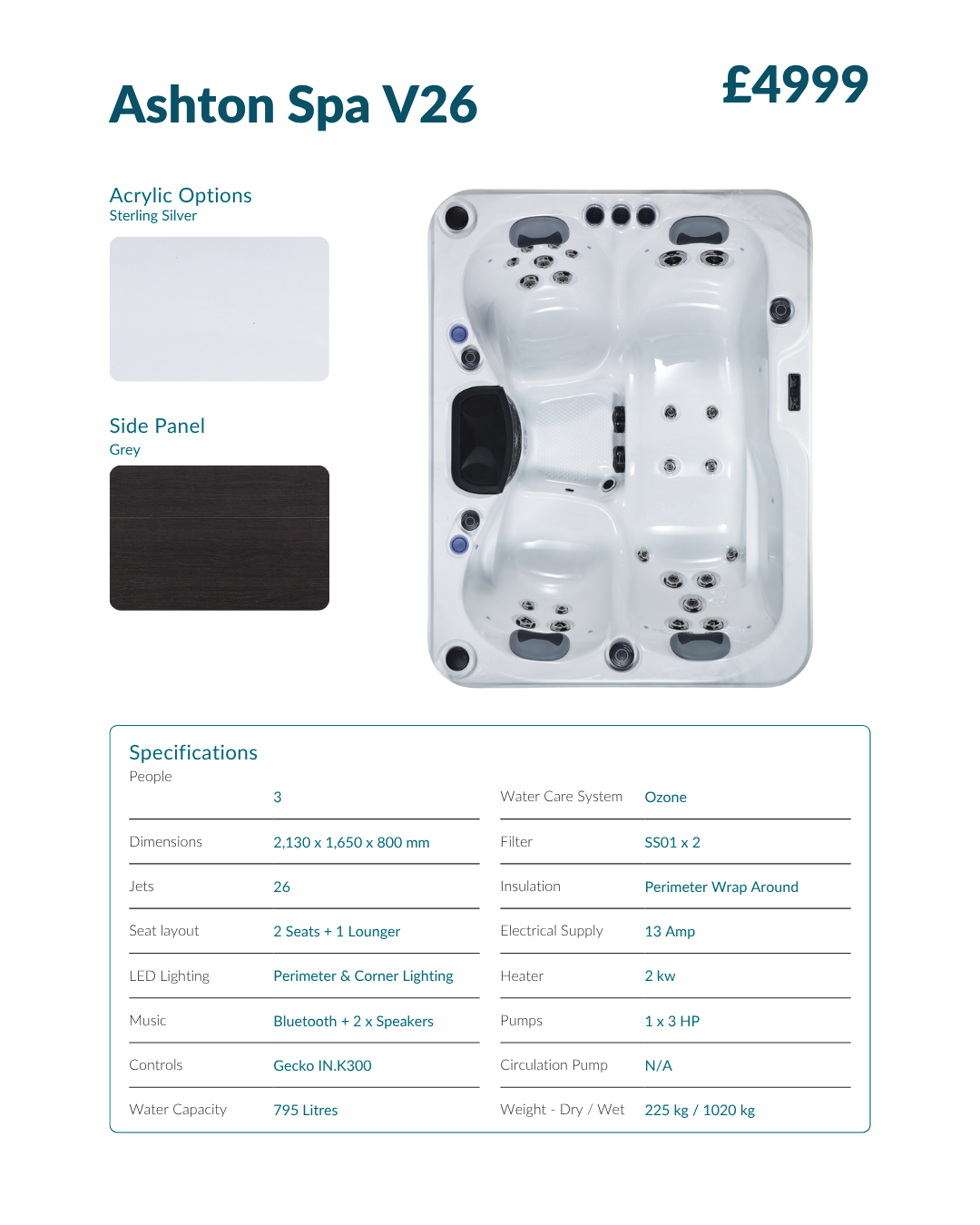 Experience pure relaxation with the Ashton Spa V26 . This sleek three‑person spa combines premium design, advanced hydrotherapy, and unbeatable comfort, making it ideal for couples, families, or anyone seeking a tranquil escape at home.