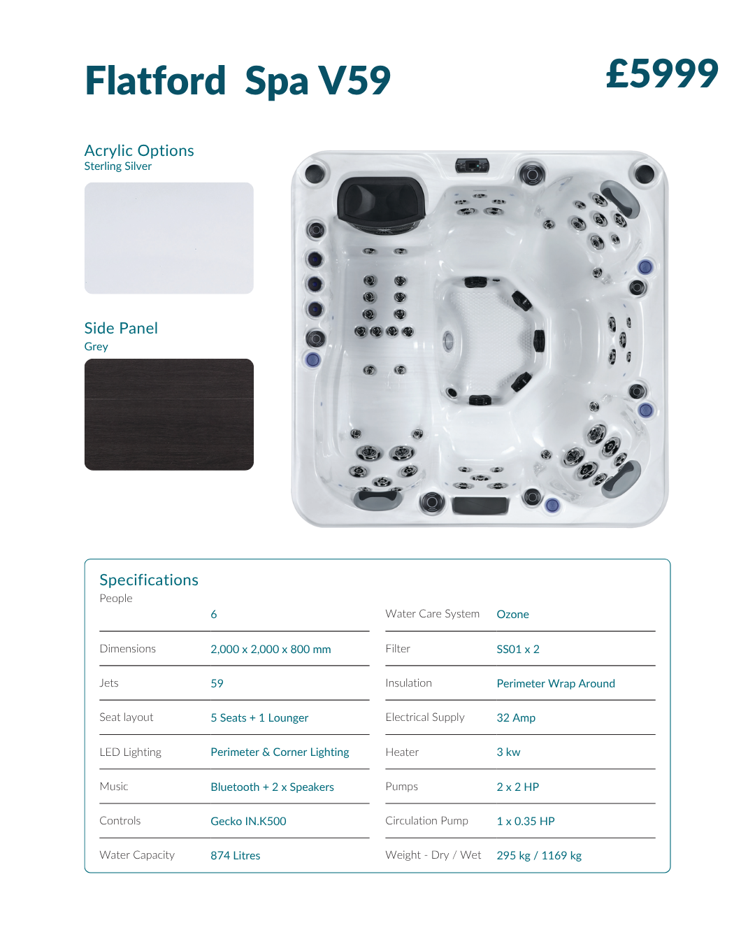 Discover the Flatford Spa V59 – a luxurious six-person spa that brings comfort, performance, and style together in one elegant design. With its deep ergonomic seating, powerful hydrotherapy, and premium features, the Flatford V59 is perfect for families, entertaining, or simply unwinding in your own private sanctuary.