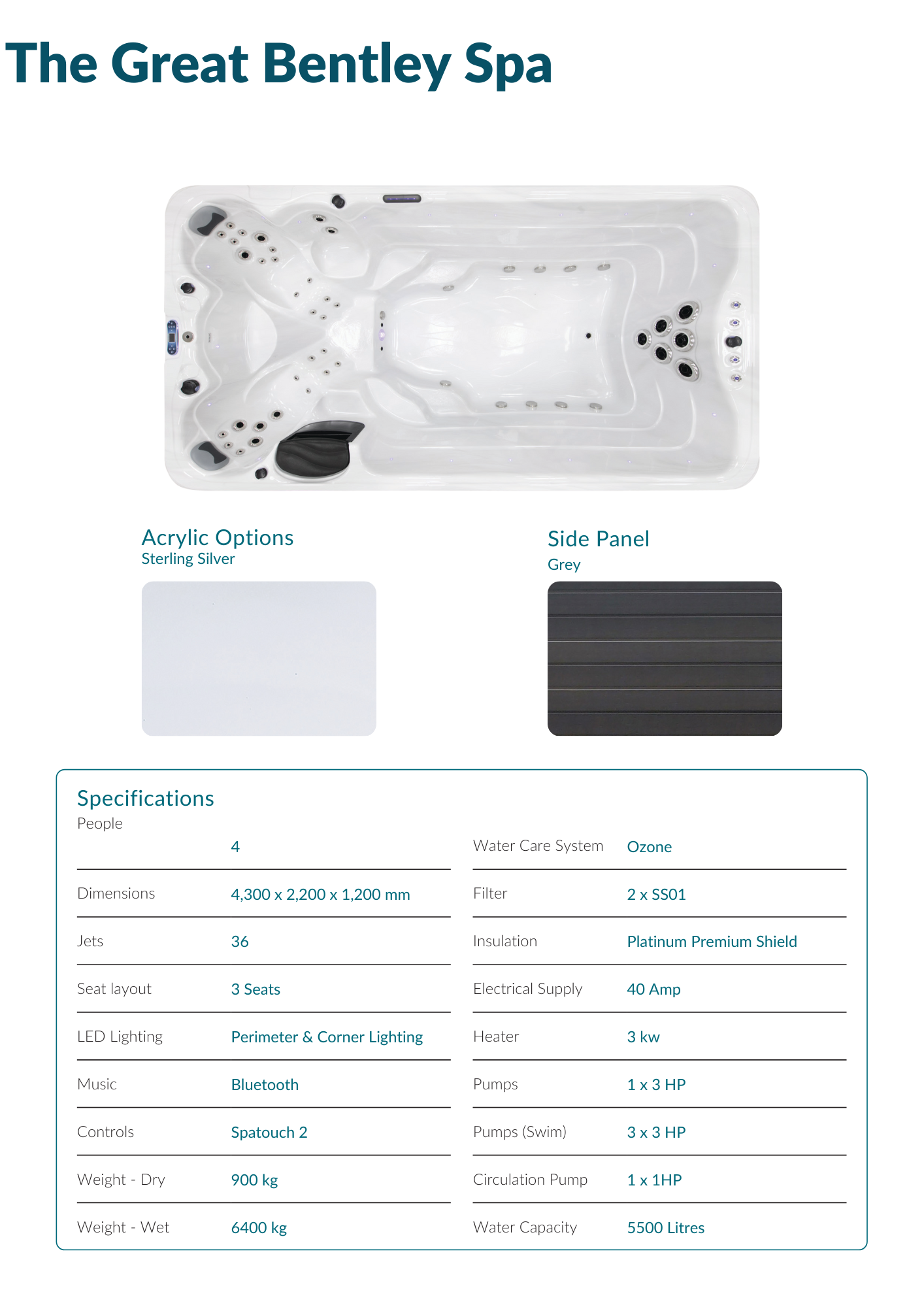 The Great Bentley Swim Spa combines powerful swim jet technology with luxurious hydrotherapy seating in a compact, energy-efficient design. Perfect for those who want to enjoy the benefits of a swimming pool and spa without the space requirements of a full-sized pool, it offers the ultimate in home fitness and relaxation.