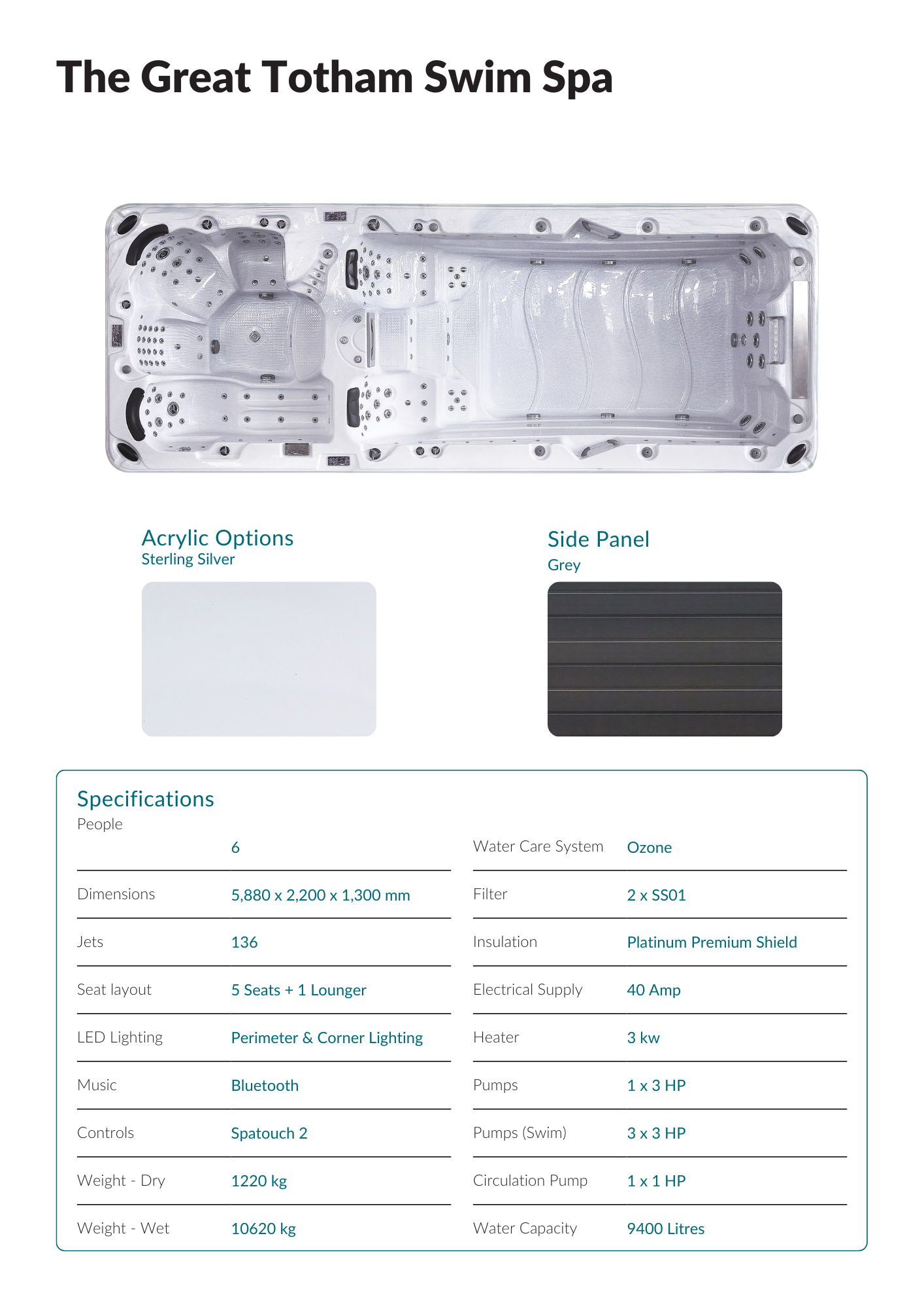 The Totham Swim Spa combines the benefits of a swimming pool with the luxury of a hydrotherapy spa, creating the perfect solution for health, fitness, and relaxation at home. Its powerful swim jets and spacious layout make it ideal for all levels of aquatic exercise, while the spa seating provides soothing hydrotherapy after your workout.